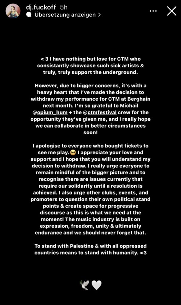 Auf der Website der CTM sind die Künstler:innen und diejenigen, die ihre Slots übernommen haben, kenntlich gemacht. Auch während des laufenden Festivals kamen Namen hinzu. In einem Statement betonen die CTM-Macher:innen, man respektiere die Entscheidung der Künstler:innen und sei mit ihnen weiter im Gespräch: