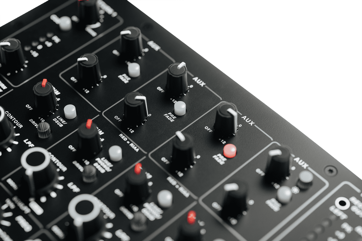 Die vier Kanalzüge des Mixers können mit verschiedenen analogen Klangquellen kombiniert werden. Trim-Potis dienen zur Steuerung der Eingangspegel und bieten eine ergänzende Drive-Option für gezielte, klangfärbende Übersteuerungen. Anstelle klassischer Dreiband-EQs sind alle Kanäle mit Hoch- und Tiefpassfiltern ohne Resonanzkopplung ausgestattet, die zur Absenkung von Frequenzen nutzbar sind.