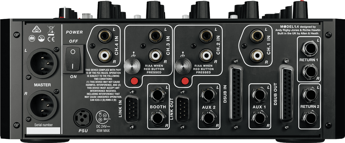 Für größere Setups mit mehreren Model-Mixern ist das Gerät mit neunpoligen Link-Buchsen ausgestattet. Die miteinander verbundenen Mixer nutzen einen gemeinsamen Master/Booth-Bus, sodass nur ein Mixer mit der Anlage verkabelt werden muss, und auch das Cueing funktioniert mixerübergreifend.