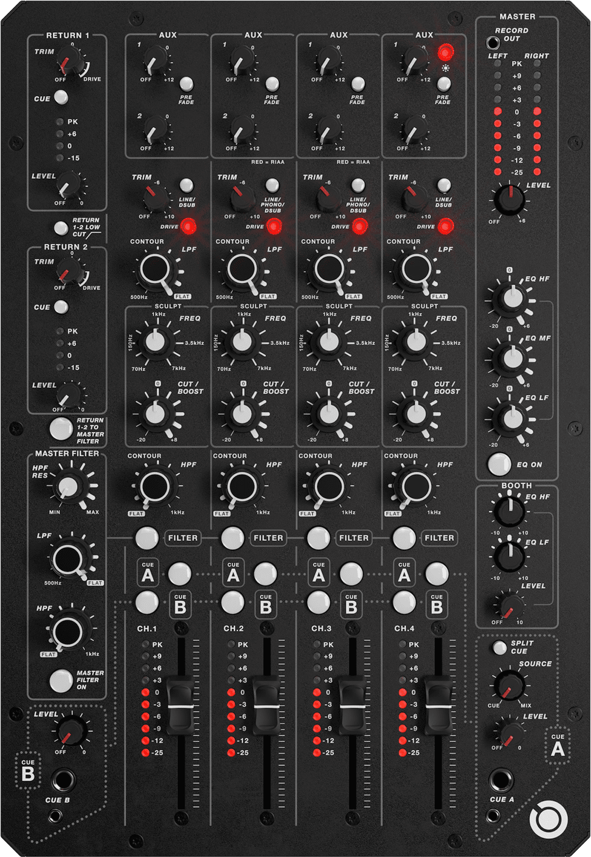 Auf der rechten Mixerseite befindet sich die Mastersektion, die mit einem Pegelregler und einer dreifarbigen LED-Kette zur Überwachung versehen ist. Zur gemeinsamen Anpassung der Master-, Record- und Booth-Signale gibt es einen gut erreichbaren Dreiband-EQ. Die Booth-Signale lassen sich separat kontrollieren und mittels Zweiband-EQ bearbeiten.
