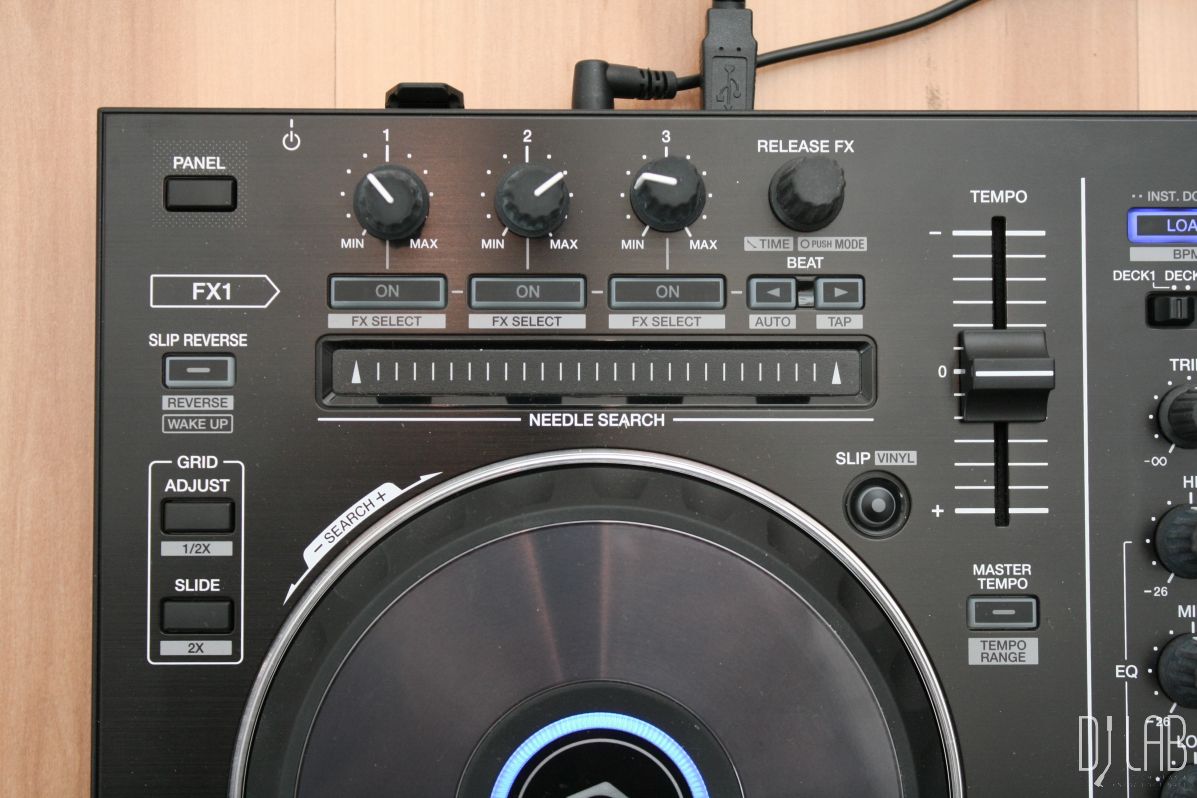 Das Tempo der Songs könnt ihr mit einem Pitchfader verändern und hierzu bei Bedarf eine Mastertempo-Funktion aktivieren, die die Tonart bei Geschwindigkeitsveränderungen konstant hält. Mit einem Needle-Search-Strip lässt sich innerhalb eines Songs navigieren und für die Effekte gibt es Drehregler, Taster und einen Encoder mit Druckfunktion.