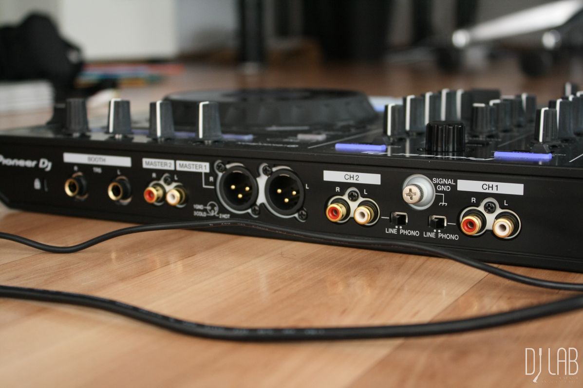 Der Controller ist mit einer Soundkarte bestückt, die mit 24 Bit und 44,1 Kilohertz zu Werke geht. Auf der Rückseite des Pioneer-Geräts lassen sich zwei Line-Pegelquellen, Plattenspieler oder ein Mikrofon für Durchsagen anschließen. Für das Masterausgangssignal gibt es symmetrische XLR- und unsymmetrische Cinch-Buchsen und das Monitorsignal verlässt das Gerät über symmetrische Klinkenbuchsen.