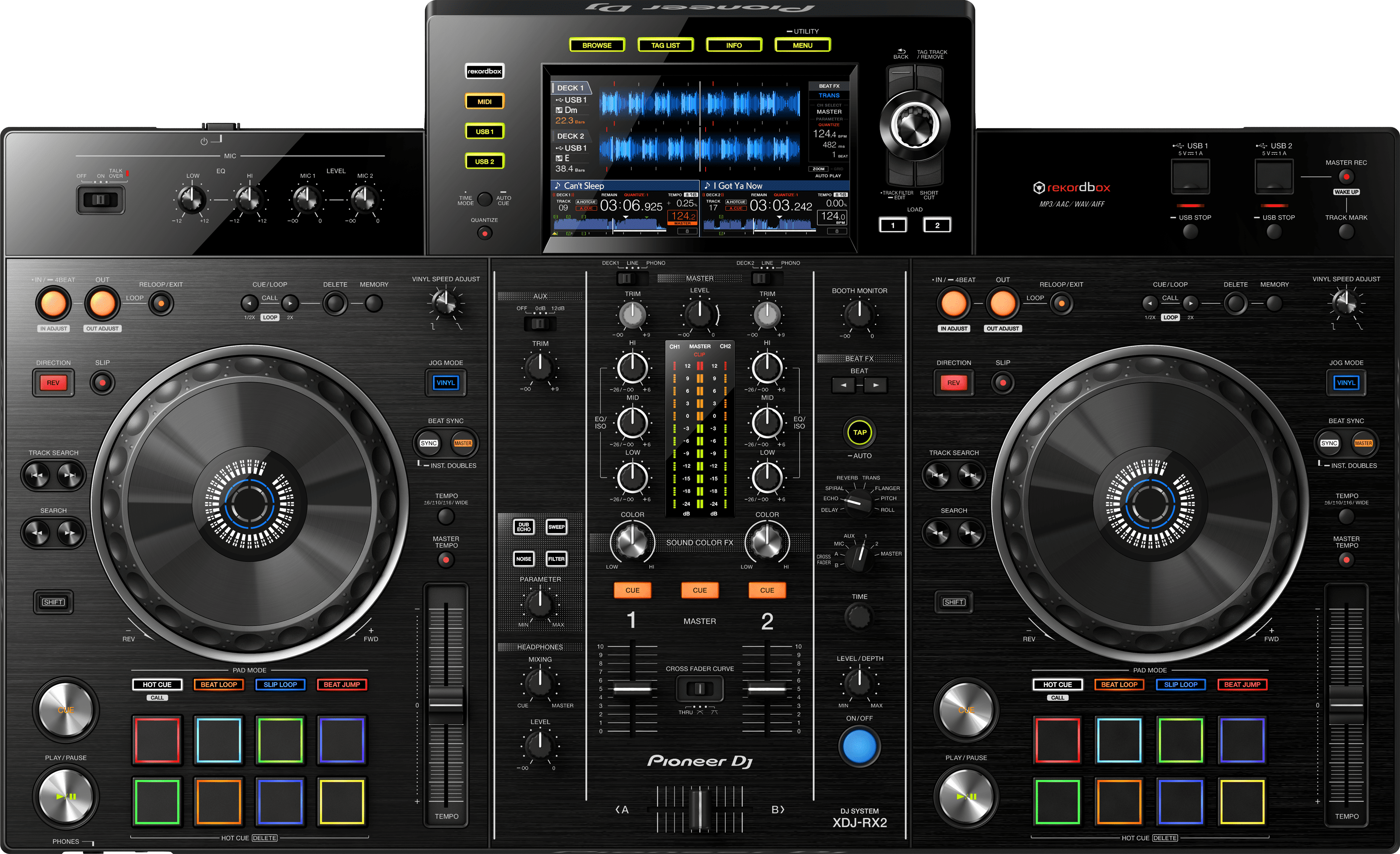Neben den bisher vorgestellten, klassisch definierten Single-DJ-Mediaplayern gibt es auch ganze Konsolen, die zwei oder mehr Decks und einen Mixer in einem Gerät unterbringen. Der XDJ-RX2 ist eine solche Konsole, die den Charakter von CDJs und einem DJM-450 besitzt. Zwei Decks mit Jogwheels und langen Pitchfadern sowie einer Loopsektion und Performance-Pads sorgen für eine ausreichend haptische Kontrolle der Tracks.