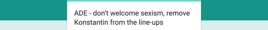 Befrieden können diese Reaktionen nicht. Dem strittigen Künstler noch mehr Raum zu geben, das finden einige nicht richtig, so auch die Initiierenden des offenen Briefes, die sich in der Folge mit einem FAQ wieder zu Wort melden: Eine Podiumsdiskussion mit Konstantin ergäbe laut dem neuerlichen Schreiben keinen Sinn, da er nicht als Sexismus-Experte auftreten könne und nach über einem Jahr des Schweigens nun auch nicht mehr erklären müsse, ob er ein Sexist sei oder nicht. Vielmehr sei er ein gutes Beispiel für den frauenfeindlichen Zustand der Szene. Auch würden ADE-Besucher dem Tagesgeschehen, bei dem es vielerlei Workshops, Diskussionen und Vorträge gibt und in dessen Rahmen die vom ADE vorgeschlagene Podiumsdiskussion stattfinden würde, nicht so viel Beachtung schenken wie den Events in der Nacht (das ADE wird aufgeteilt in Tages- und Nachtveranstaltungen). Wenn ein Künstler vom Line-Up einer Party ausgeschlossen würde, wäre die Wirkung viel größer, so der Gedanke. Und eine solche Reaktion sei wichtig, um zu zeigen, dass Sexismus in einer Szene, die sich auf die Werte von tolerantem und freiheitlichem Miteinander beruft, nicht ohne Konsequenzen bleibt.