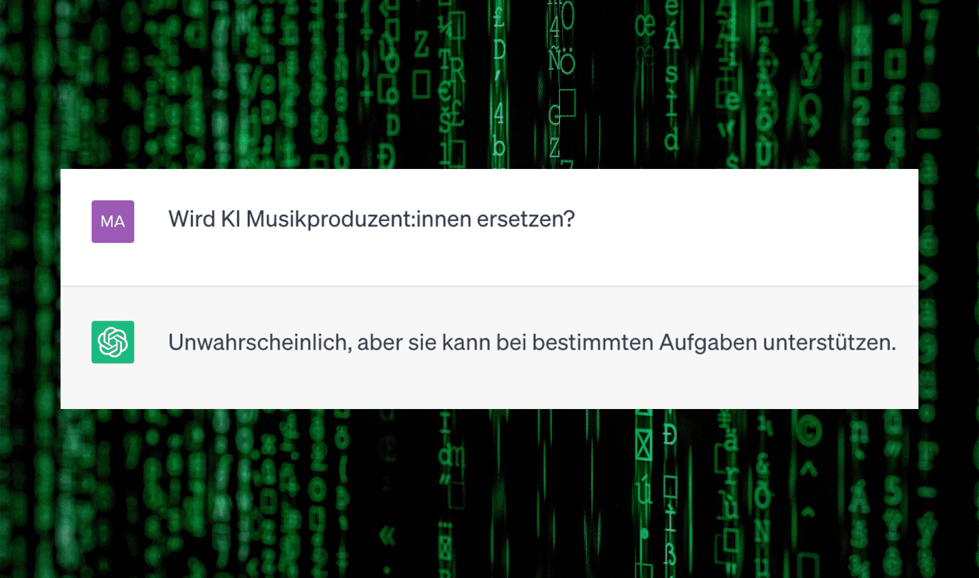 Laut der Umfrage werden Menschen aber auch in Zukunft für die Musik-Erzeugung notwendig sein. Nur rund 8 Prozent der Befragten gehen davon aus, dass KI-Tools in den nächsten fünf bis zehn Jahren alle anderen Produktions-Tools ersetzen werden. Vielmehr sehen die meisten KI als ein praktisches Hilfsmittel, welches den Workflow und die Arbeitsprozesse vereinfachen und beschleunigen kann. Ähnlich wie die Befragten sieht es letztlich auch ChatGPT (siehe Titelbild). Die KI wird eine bedeutende unterstützende Rolle einnehmen können, aber zumindest nicht in naher Zukunft den gesamten Prozess der Musikerzeugung übernehmen.