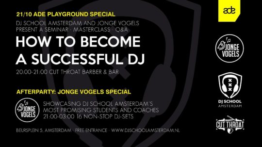 Die DJ School Amsterdam ist eine der führenden Institute Europas in der DJ- und Producer-Ausbildung. Seit 2008 wurden bereits mehr als 1000 Schüler ausgebildet. Im Rahmen dieser Masterclass geht man den Fragen nach, was einen Top-DJ ausmacht, wie man in der Brache erfolgreich wird und wie man an mehr Gigs kommt. Die DJ School Amsterdam wird des Weiteren das ADE dazu nutzen um eine Sonderausgabe der hauseigenen Clubnacht „Jongle Vogels“ zu veranstalten. Dieses Event bietet den größten Talenten der Schule eine Plattform um vor Publikum zu performen und sich zu präsentieren.