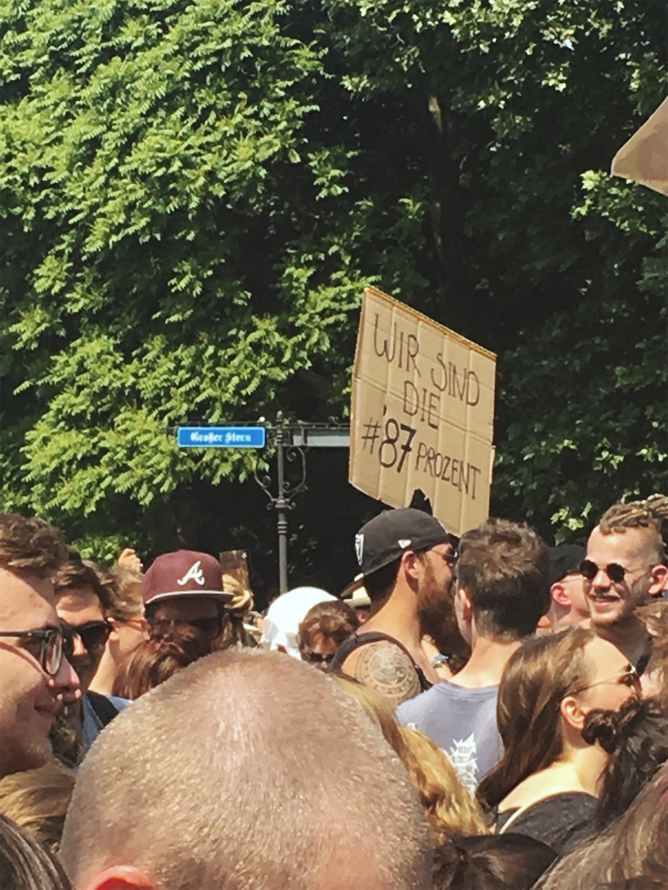 Apropos Momente: Der Zug hatte einiges an Gänsehaut. Das Gefühl für etwas Wichtiges, Schützenswertes Partei zu ergreifen war allgegenwärtig und elektrisierte die Teilnehmenden. Damit hatte die Veranstaltung durchaus auch den Anflug von etwas Historischem inne, „so muss sich die Loveparade am Anfang angefühlt haben“ war öfters zu vernehmen.