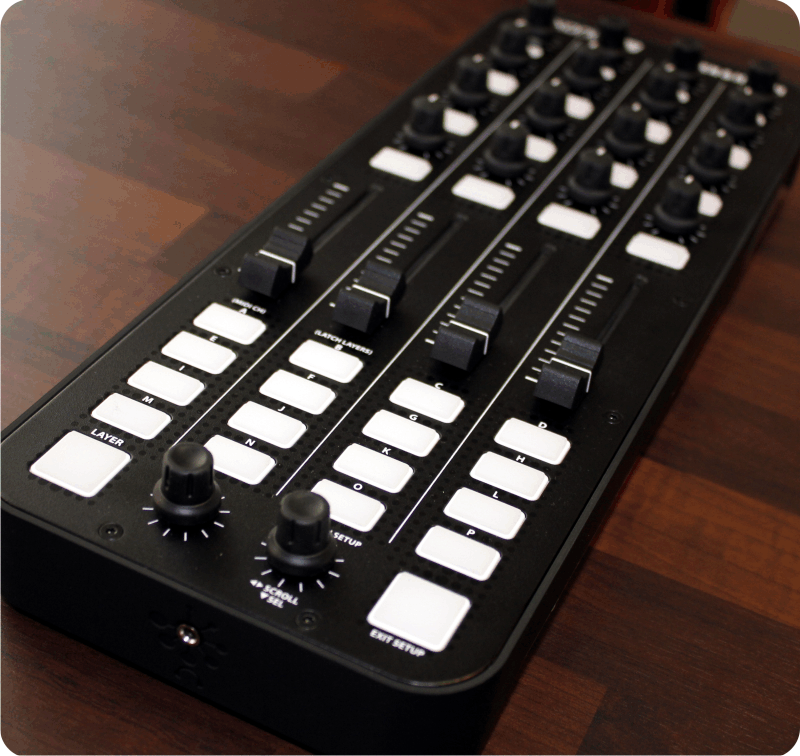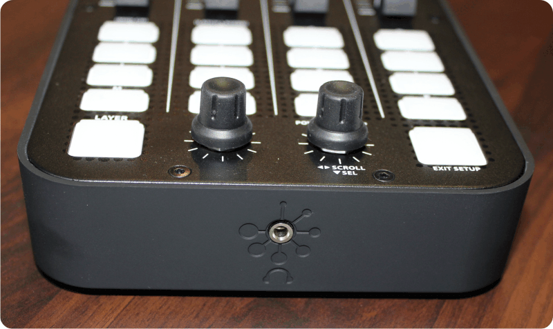 Neben 6 Endlos-Pushencodern und 12 Drehreglern mit Anschlag (aber ohne Mittenrasterung) gibt es vier Fader und 29 hintergrundbeleuchtete Druckknöpfe. Eigentlich sind es ja 30 Buttons, einer jedoch steuert die schon eingangs erwähnte Layerfunktion. Auf diese könnte man zwar auch verzichten und Button #30 genauso wie seine 29 Kollegen verwenden, würde damit aber ein wirklich tolles Killerfeature außer Acht lassen.