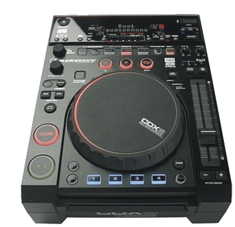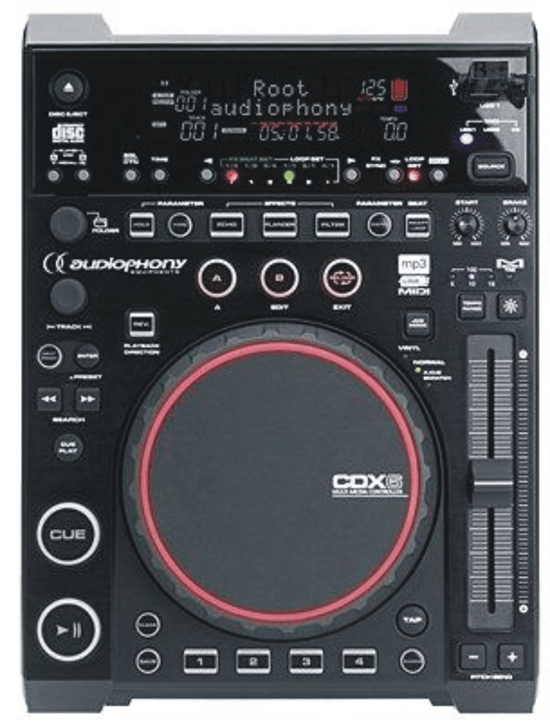 Der Audiophony CDX6 ist ein DJ CD-Player mit einer sehr umfangreichen Ausstattung wie +/-100% Pitch, Sampler, 4 Hotcue Tasten, Beatcounter, sensitives Suchrad, Scratch, Effekte, MP3-Wave Wiedergabe mit iD3 CD-Text Anzeige, Midi Controller und 3 USB Ports. Bei diesem Modell können 2 CD-Spieler gleichen Typs durch eine Linkfunktion unabhängig auf eine gemeinsame Festplatte zugreifen. Durch die Midi-Fähigkeit kann der CDX 6 auch als Hardware Controller für verschiedene DJ-Software benutzt werden. Die eingebauten Effekte lassen sich dank des automatischen Beatcounters mit der gespielten Musik synchronisieren. Sein Slot-In Laufwerk sorgt für höchste Stabilität selbst beim härtesten Road Gig und sein Antishock Speicher schützt vor Drop-outs. Das hochauflösende farbige Display des Audiophony CDX-6 informiert über den Zeitverlauf, Geschwindigkeitsveränderung und die Beats per Minute. Über die 3 USB buchsen wird die nötige Conectivity zur digitalen Welt geschaffen.