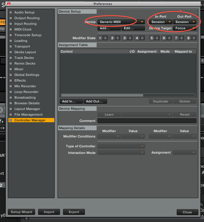 Als In- und Out-Port wählt ihr die Session, die Ihr im Audio-Midi-Setup definiert habt und weisst anschließend die gesendeten MIDI-Befehle, von der App mit der ihr fernsteuern wollt, in die gewünschten Kommandos für Traktor um. Vorraussetzung ist hier, dass man sich mit dem Traktor MIDI-Mapping auskennen!