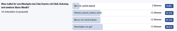 Zum anderen: MOSHPIT? Auf ner Party? Ist das gut? Ist das schlecht? Habe ich eine Meinung? Nicht so wirklich, wie die meisten der 44 Teilnehmer der Umfrage. Es gilt immer "Tanze als wenn Dir keiner zusieht". Wobei am Rand des Dancefloors der Geist von Rozalia Luksenburg steht und sagt "Freiheit ist immer ....". Was sich auch auf Bewegungsfreiheit anwenden läßt. Und da sollte man im Club tanzen, nicht moshen. Okay, vielleicht temporär und mit Rücksicht.Aber wer bin ich, solche Vorschriften zu machen?
