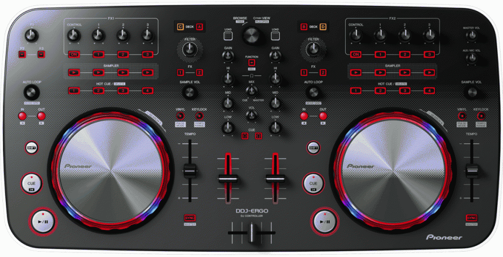Die Fakten: der DDJ-ERGO-V (so die offizielle Bezeichnung) ist ein DJ-Controller für bis zu vier Decks (per Umschaltung A/C bzw. B/D) mit integrierter Soundkarte, rein USB Bus-powered und Atomix Virtual DJ LE im Lieferumfang. Die Bedienoberfläche ist sehr auf Traktor 2 zugeschnitten, was das Layout und die Bezeichnung der ganzen Buttons und Encoder betrifft. Dies dürfte sicherlich viele T2 User freuen.