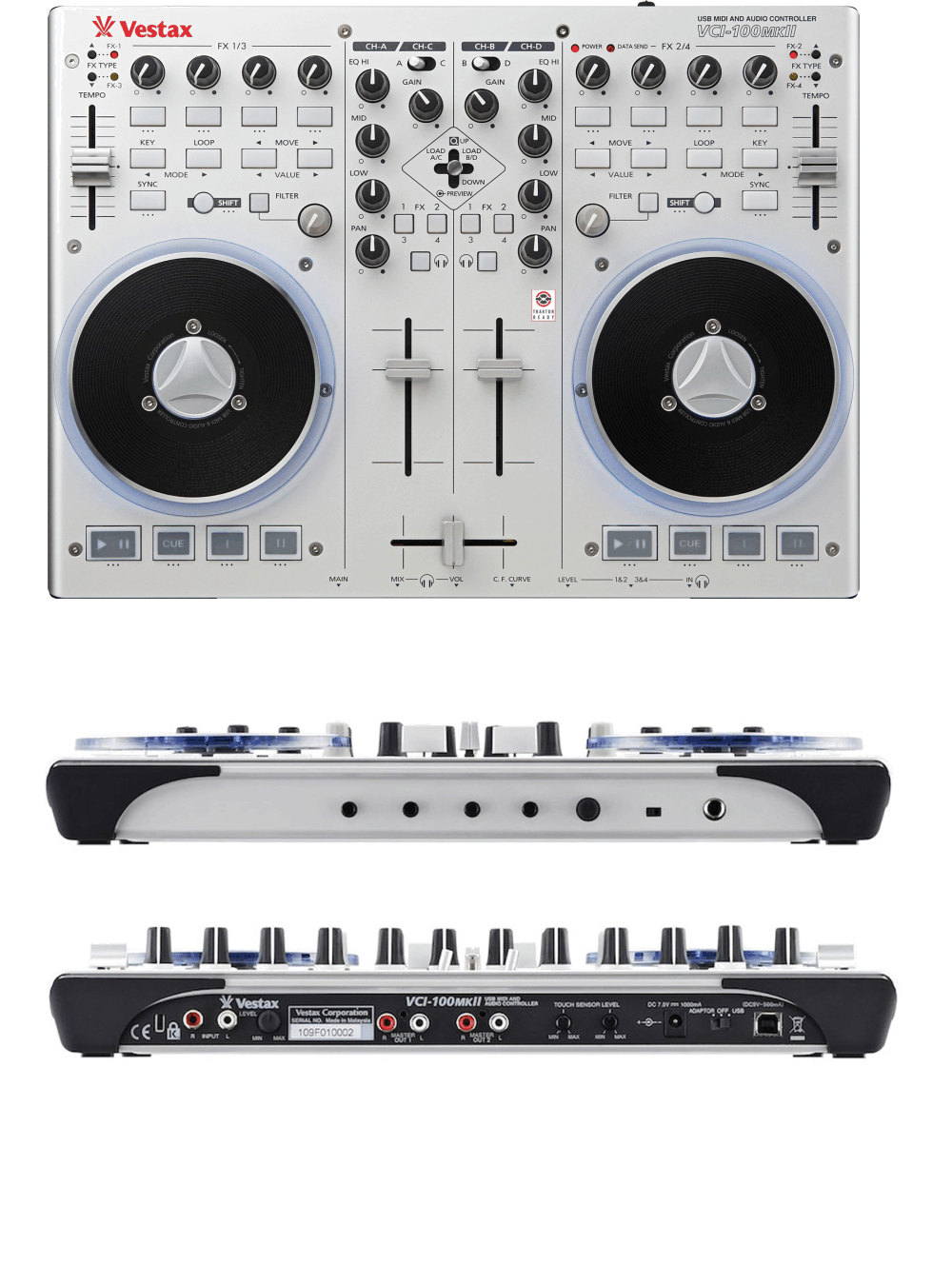 Mit dem VCI400 bietet Vestax den Panzer unter den Controllern an.  Das Vollmetalgehäuse der VCI100 ist legendär, der große Bruder hat ein ebensolches. Vier Kanalzüge mit je einem eigenen, großen Filterregler, zwei Effekt- und eine Loop Recorderfunktion, große Buttons für Cue-Punkte und einstellbare Jogwheels. Alles in der bekannten "bulletproof" Qualität.  Mitgeliefert wird eine 4-Deck Version von Virtual DJ LE und das noch recht junge Serato Intro (welches zwei Decks bietet). Für beide Programme liegen passende Overlays bei. Für Traktor gibt es schon eine *.tsi, ob auch ein Overlay im Lieferumfang sein wird, ist noch offen. Wie der S4 muss auch der VCI400 ohne regelbaren Booth Out auskommen.