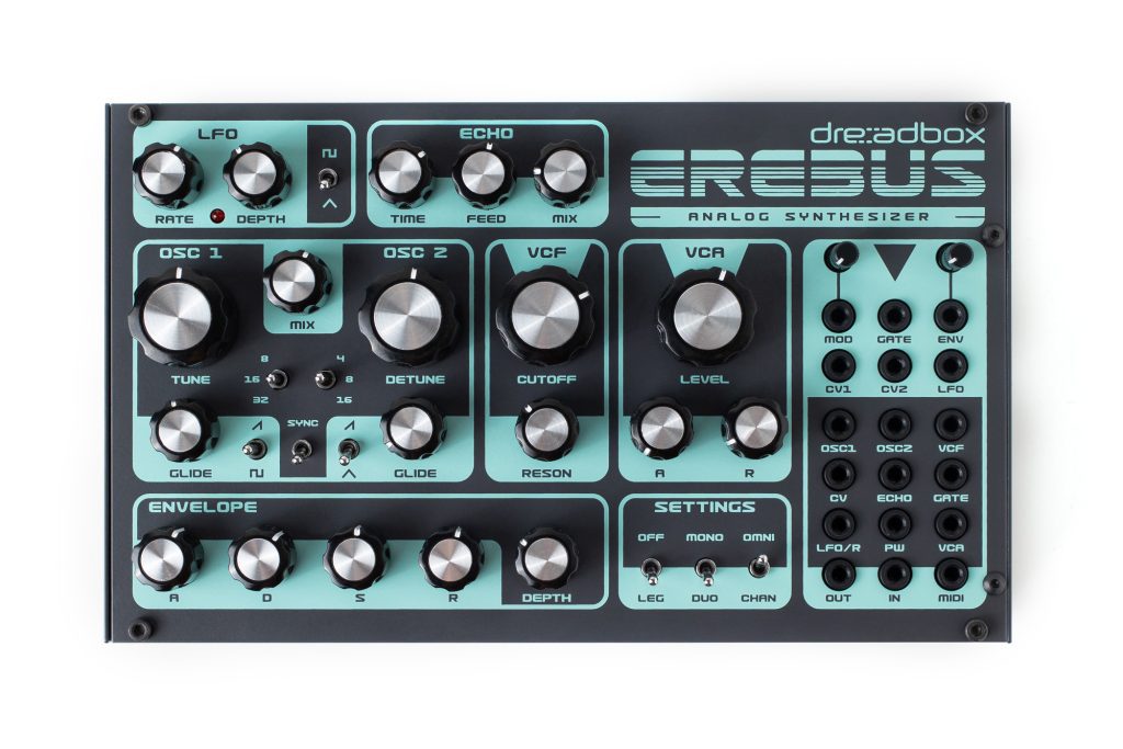 Der Erebus ist einer der ersten Synthesizer aus dem Hause Dreadbox und wurde 2020 noch einer dritten Version neu veröffentlicht. Das DIY-Kit orientiert sich aber mehr an dem ursprünglichen Aufbau des Erebus V1. Zwei Oszillatoren (mit jeweils zwei Wellenformen) sorgen dafür, dass der Synthie entweder monophon oder zweistimmig paraphon gespielt werden kann. Dazu kommen ganz klassisch eine ADSR-Hüllkurve, ein LFO, VCA, ein Filter und ein "Lo-Fi Delay". Gespielt wird der Erebus dann über MIDI oder die 15 CV-Eingänge.