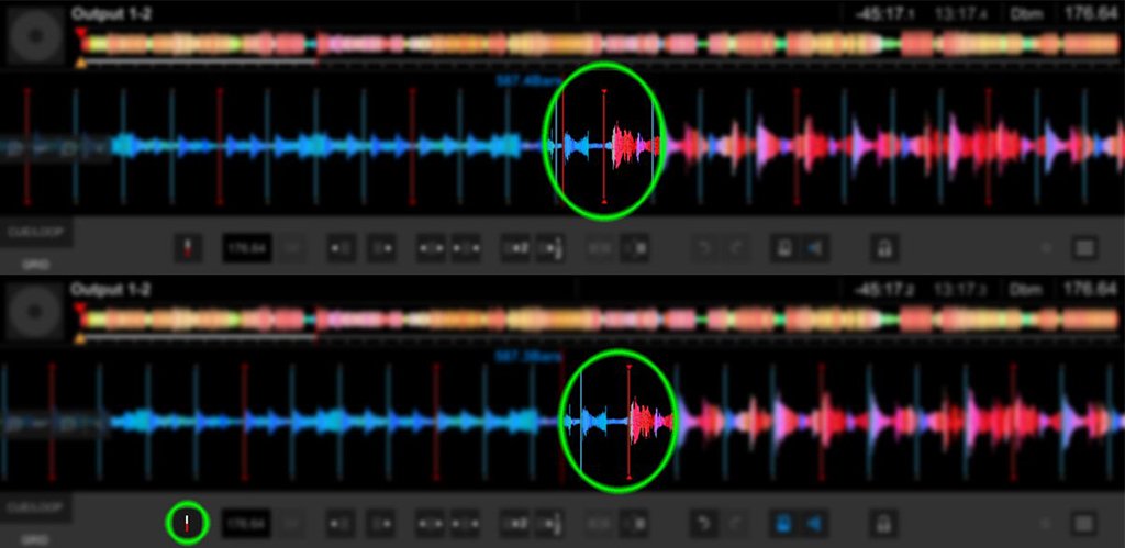 Bei geradlinigen Tracks im 4/4-Takt hat man durch die Wellenformdarstellung und das zuschaltbare Metronom sowohl eine eine optische als auch akustische Hilfestellung. In den meisten Fällen liegt der Gridmarker an der ersten Bassdrum an (dunkelrote Amplitude). Das kann entweder am Trackanfang oder beim Drop (wenn der Track wieder voll einsetzt) sein. Ist das nicht der Fall und der Marker sitzt versetzt, so kann man diesen durch das Setzen eines neuen Gridmarkers mit einem Klick korrigieren. (Der Gridmarker sollte nach Möglichkeit immer am Taktanfang gesetzt werden und nicht irgendwo im Takt, da dies z.B. das Phasenmeter auf einem CDJ oder XDJ beeinflussen kann.)