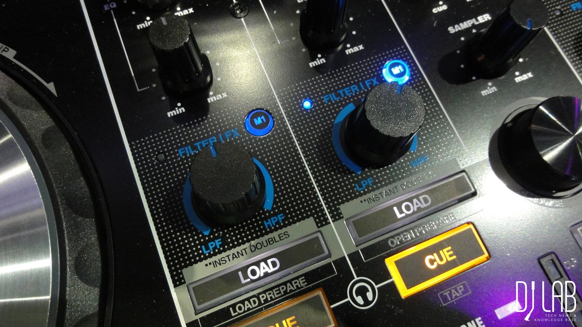 Im Faderbereich gibt es keine Auffälligkeiten. Der Crossfader ist sehr leichtgängig und birgt ein Cut-Lag von 1mm oder mehr (wenn man die Faderkruve auf "scharf" stellt). Alle Fader weisen ein leicht seitliches Spiel auf und besitzen keinen Filzstaubschutz. Die Kanalfader sind etwas schwergängiger als der Crossfader und bieten einen angenehmen Widerstand fürs Mixing. Die Mastersektion ist mit allem ausgestattet, was benötigt wird, auch einem Sampler-Volume Regler. Eine Besonderheit zeigt sich bei den Filterreglern mit einer kleinen Macro-Taste, die es erlaubt das Filter mit Effekten zu kombinieren. Je nach Effekt lassen sich hier schon ein paar coole Kombinationen nutzen, um in den Sound einzugreifen. Pro Kanal steht standardmäßig ein 3-Band EQ und Gainregler zur Verfügung.
