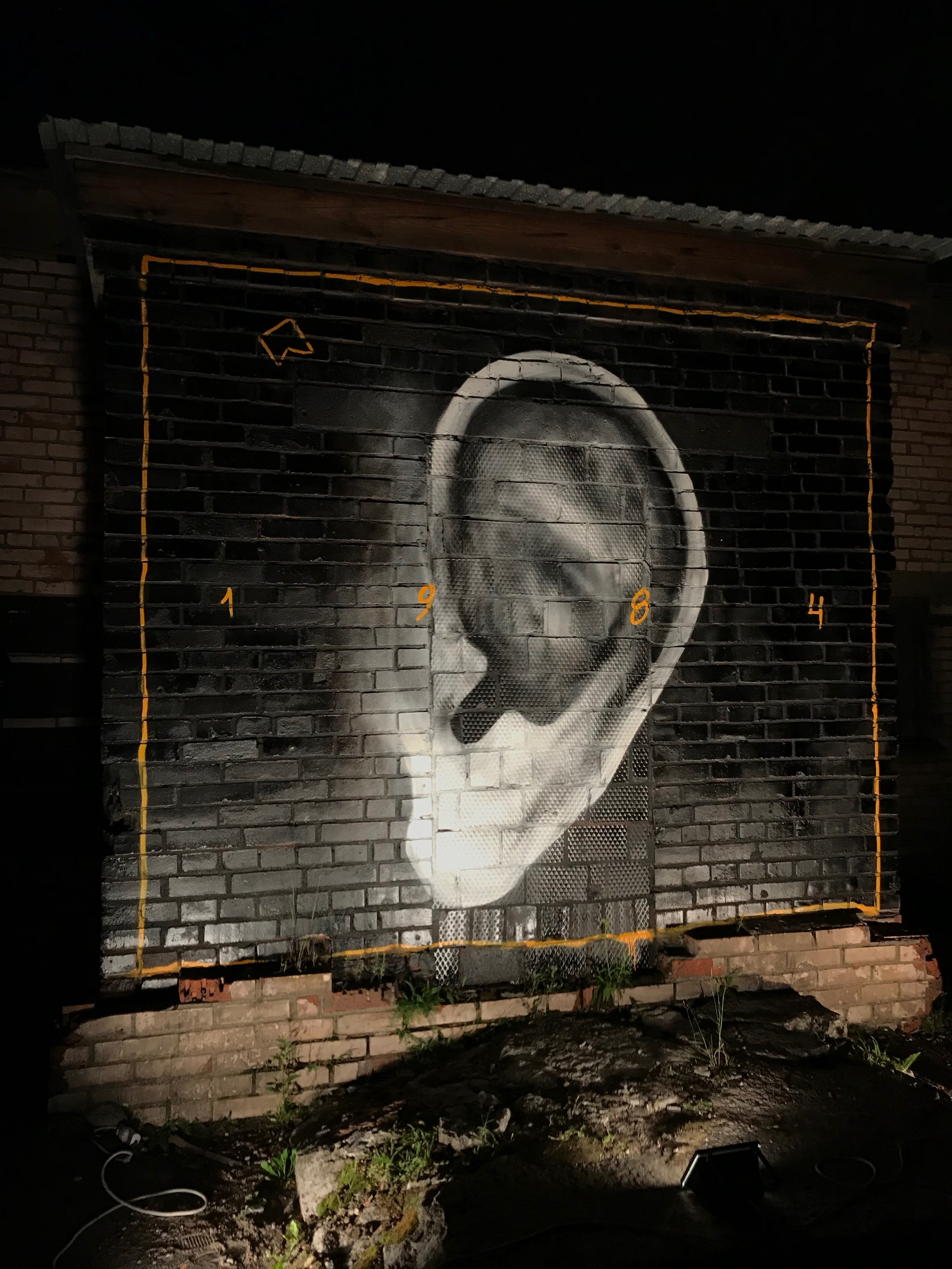 Immer wieder applaudieren Menschen, tauschen Rubel gegen Wertmarken, stehen am Gamma Shop an, um noch ein T-Shirt oder eine Tasche zu bekommen. Einige fotografieren sich vor einem Graffiti. An einer Mauer ist ein Ohr angesprayt, darüber stehen die Zahlen 1 9 8 4. Auch ein abstraktes Werk ineinander verschlungener geschlechtsloser Körper ist ein beliebter Fotohintergrund.