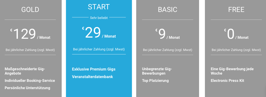 Die Basismitgliedschaft bei GIGMIT ist kostenlos. Diese erlaubt die Erstellung von einem Presskit und eine Bewerbung auf einen Gig pro Woche. Darüber hinaus gibt es noch ein Premium-Basispaket für 9 Euro (netto) im Monat. Über das kann man sich unbegrenzt auf Gigs bewerben, aber nicht auf alle. Für die Premiumgigs braucht man nämlich ein Premium-Startkonto. Das kostet schon mal 29 Euro (netto) im Monat. Im Gegenzug erhält man zusätzlichen Zugriff auf eine Veranstalterdatenbank.