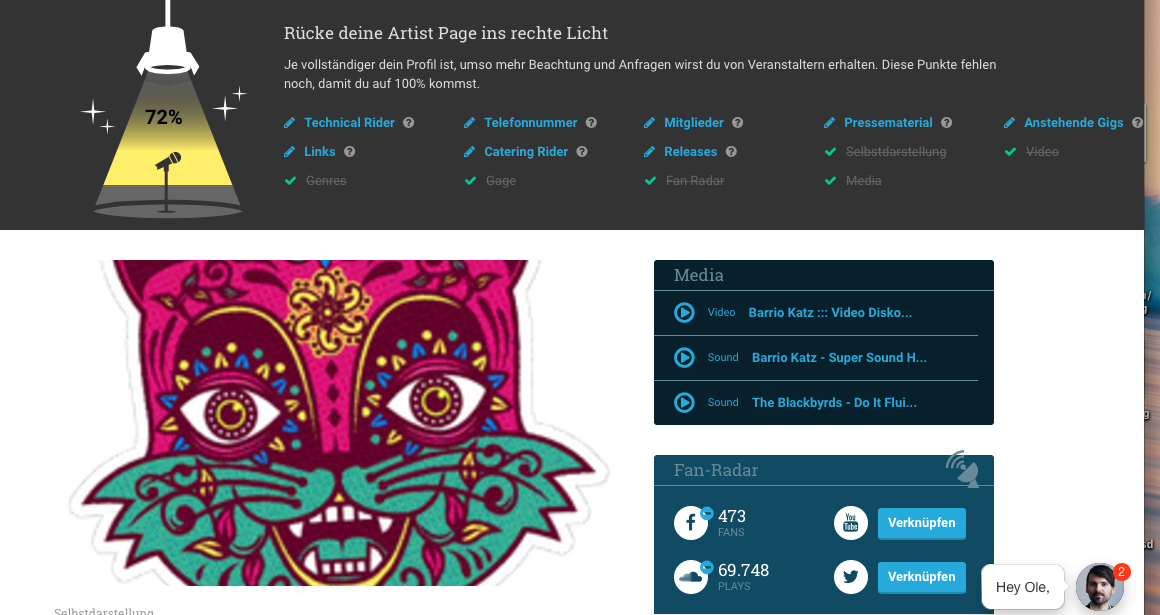 Letztens habe ich gelesen, dass Kinder eher schönen Menschen vertrauen. Veranstalter wiederum vertrauen schönen Artistprofilen. Ein solches gilt es zu erstellen. GIGMIT bietet die Möglichkeit ein komplettes EPK (Electronic Press Kit) zu erstellen. Neben blumigen Worten zum eigenen Tun, Bildern, Tracks, Videos oder sonstigen Releases, können an dieser Stelle bereits detailierte Technik- und Cateringrider hinterlegt werden. Dazu gibt es ein "Fanradar", welches auf einen Blick Auskunft über die eigene Beliebtheit in sozialen Netzwerken gibt. Hmm, vermutlich vertrauen Veranstalter besonders diesem Part.