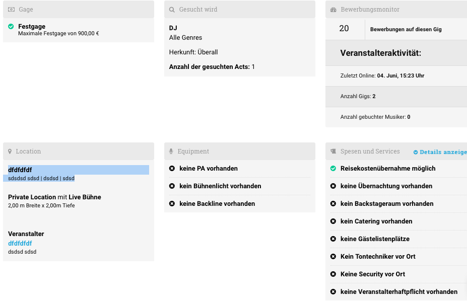 dfdfdfdf in sdsdsd sucht DJs aller Genres und von überall. Weitere Angaben zu Details fehlen komplett. Immerhin werden Reisekosten übernommen und 900 Euro Gage in den Raum gestellt. Das erklärt, warum sich bereits 20 DJs beworben haben. Mir erscheint eine Bewerbung sinnlos. Vielleicht lege ich zuviel Wert auf eine gewisse Grundseriosität, welche in diesem Fall nicht gegeben scheint.