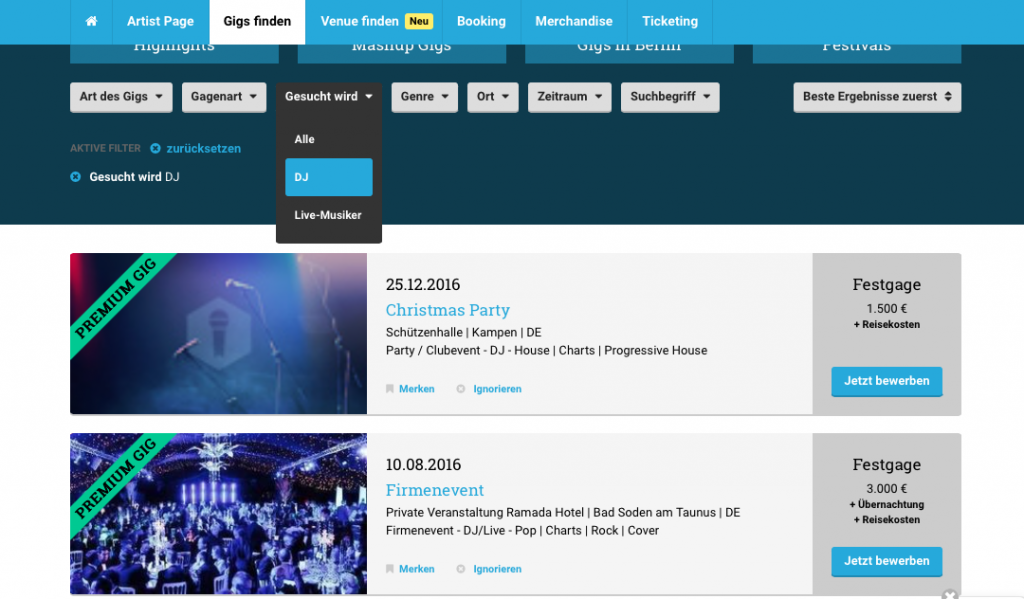 Nun aber zum "Plötzlich am Meer Festival". Beziehungsweise nicht, denn das taucht auf bei GIGMIT gar nicht auf. Dafür ein "Sonne über Berlin Festival". Ein Premiumgig, der 150 Euro Gage ausschreibt. Gesucht werden auch hier Minimal-, Techno- und House-DJs. Weltstadt Berlin - ich bin raus. Aber, was ist ein Premiumgig?