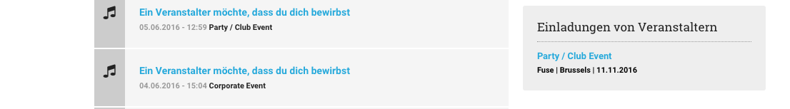 Direkt über das Dashboard von GIGMIT laufen auch Einladungen von Veranstaltern ein. Per Mail wird man zudem auf anstehende Highlights aufmerksam gemacht. Aber schauen wir mal genauer hin. Da sucht das Puppet Rock Festival aus dem tschechischen Pilsen DJs für den Fuse Club im belgischen Brüssel? Die Genres: Drum ’n Bass, House Minimal House, Tech, Trance, Acid, Progressive House. Ich nehme an, dass das von mir auch bediente (und ausgewählte) Genre Drum'n Bass zu einer Einladung an mich führte. Würden wenigstens zwei Genres mit meinen übereinstimmen, würde ich mich glatt mal bewerben. So lass ich es. Überhaupt - das nebenbei - beschränken sich die Gesuche in vielen Fällen auf "Techno, House, Electro".