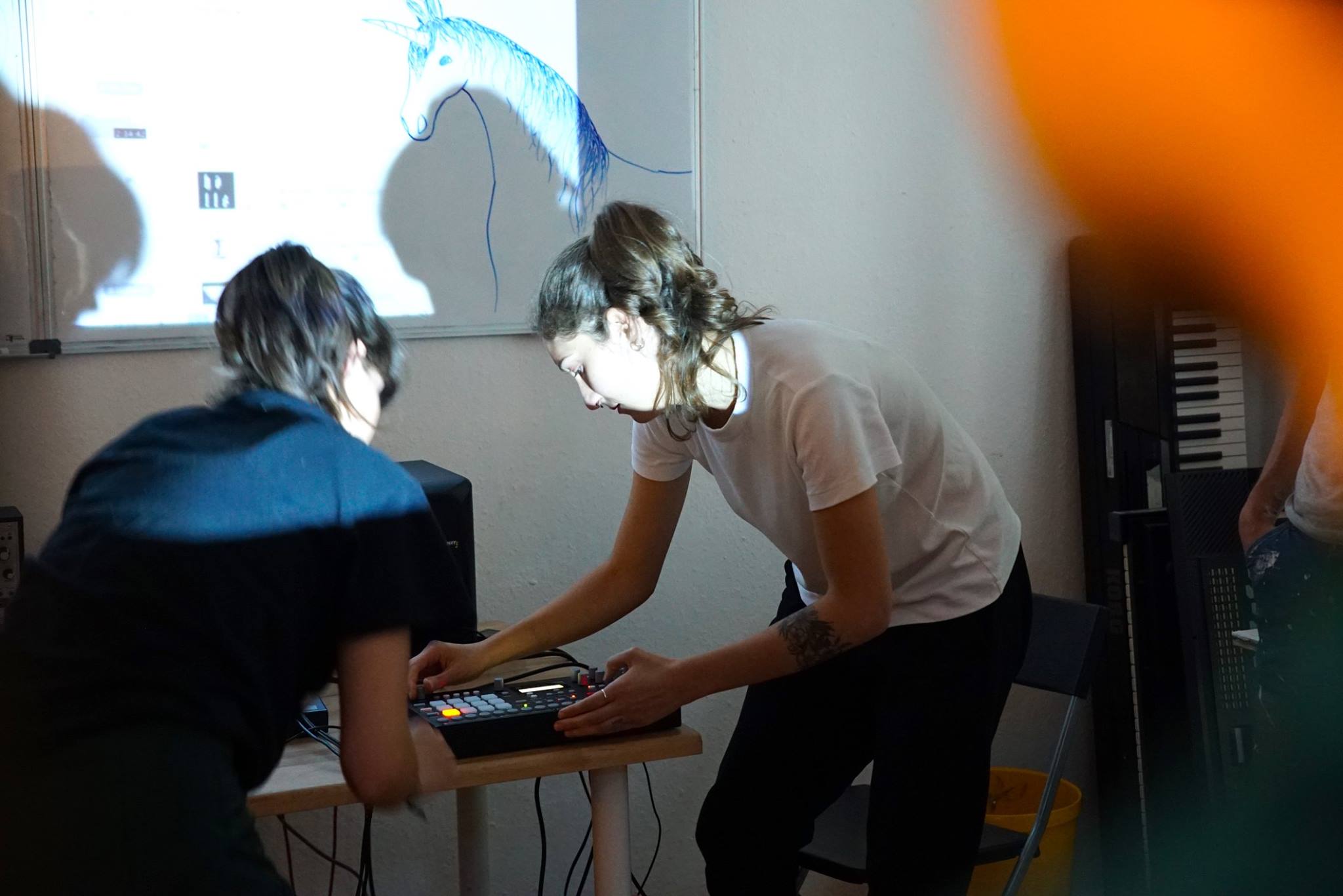 Isabella schnappt sich die MPC 1000 und eröffnet den Vortrag zum heutigen Thema: Drum Machines. Wer Lust hat, konnte auch sein eigenes Equipment mitbringen und Einblick in seinen Arbeitsprozess geben. Wie kriegt man Samples auf die MPC, welche Funktionen gibt es und was ist eine Groove Box? Im Common Ground gibt es keine dummen Fragen, von blutigen Anfängern bis fortgeschrittenen Gearheads sind alle willkommen. „Uns war es wichtig, eine entspannte Atmosphäre zu schaffen, in der sich alle trauen ihre Fragen zu stellen, ohne sich blöd vorzukommen“, sagt Zuzana.