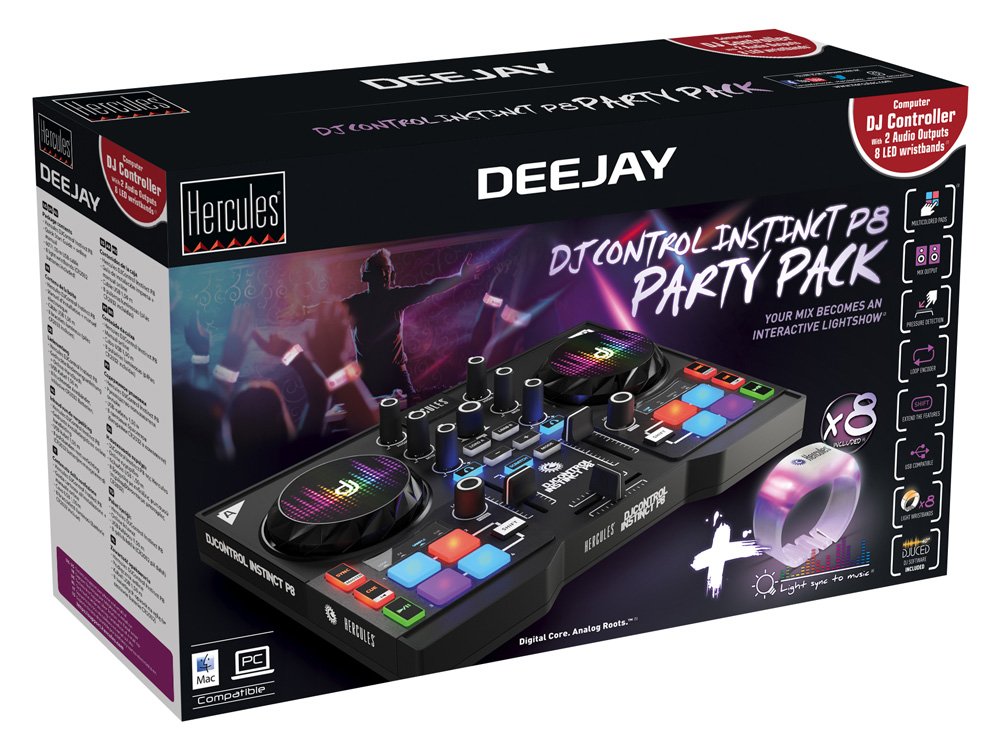 Ausgestattet mit dem neuesten Sprößling der Hercules-Familie, besteht dieses Pack aus dem DJControl Instinct P8, einem robusten all-in-one Mobile-Controller mit 8 mehrfarbigen Pads, eingebauter Soundkarte und den wesentlichen Mix- und Remix-Features, und 8 Licht-Armbändern, die im Takt der Musik leuchten. Dieses System ist extrem einfach zu nutzen: Einfach die Armbänder anschalten und mit dem Rythmus der Musik synchronisieren. Damit wird es farbig auf dem Dancefloor, denn die Armbänder pulsieren in 16 verschiedenen Farben. Dieses innovative und moderne Pack fügt Parties eine neue Dimension der Interaktivität hinzu. DJs können nun ihr Publikum dazu animieren, eine individuelle Athmosphäre zu erschaffen. An Nachhaltigkeit ist durch die auswechselbaren Batterien gedacht worden.