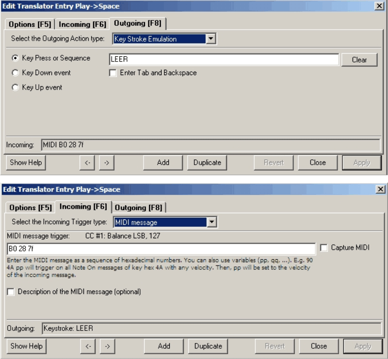 Hier lassen sich nun jedem gewünschten MIDI-Befehl die verschiedenen Übersetzungen zuweisen. Bei Incoming wird der Eingangsbefehl verwaltet, und bei Outgoing erstellt man das neue Kommando.