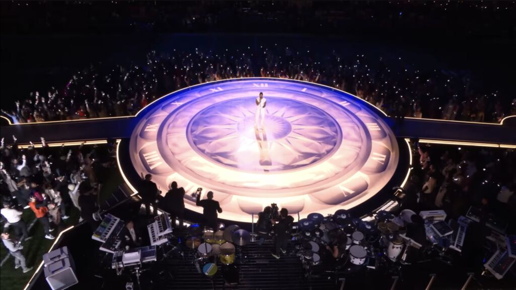 Während der Halbzeitshow konnte man einen Blick von Oben auf die gesamte Bühne samt Band erhaschen. In der Ecke unten links sieht man ein großes Key Setup, in dem auch der neue Moog Synthesizer zu sehen ist. Zugegeben, dieser Blick enthüllte nicht wirklich viel. Da beim Super Bowl aber alles geplant und jede Werbung bewusst platziert wird, darf man davon ausgehen, dass auch dieser Moog genau dort für kurze Zeit zu sehen sein sollte.