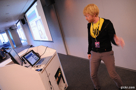 Im nachfolgenden Video ist ein Programm zu sehen, welches das Abspielen von Sampleloops ermöglicht und diese per Kinect zu manipulieren. Der in 8 bars zerstückelte Loop wird in einem Kreis dargestellt und es ist möglich per Handbewegung im Takt die einzelnen Parts zu triggern. Der rote Punkt zeigt die Position der Hand, der grüne Balken zeigt die aktuell abgespielte Position im Loop und der blaue Kreis stellt die gesamte Geschwindigkeit dar. Bewerkstelligt wird das ganze mit Max 6 und Synapse um die Verbindung zu Kinect herzustellen.