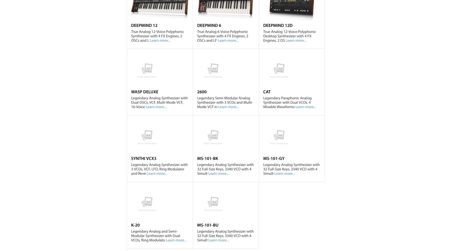 - MS-101-BK, MS-101-GY, MS-101-BU: Nachbauten des Roland SH-101; Analoger Synthesizer mit 32 Keyboard-Tasten, VCF, ADSR, 32-Step-Sequencer, Arpeggiator und Live-Performance-Kit