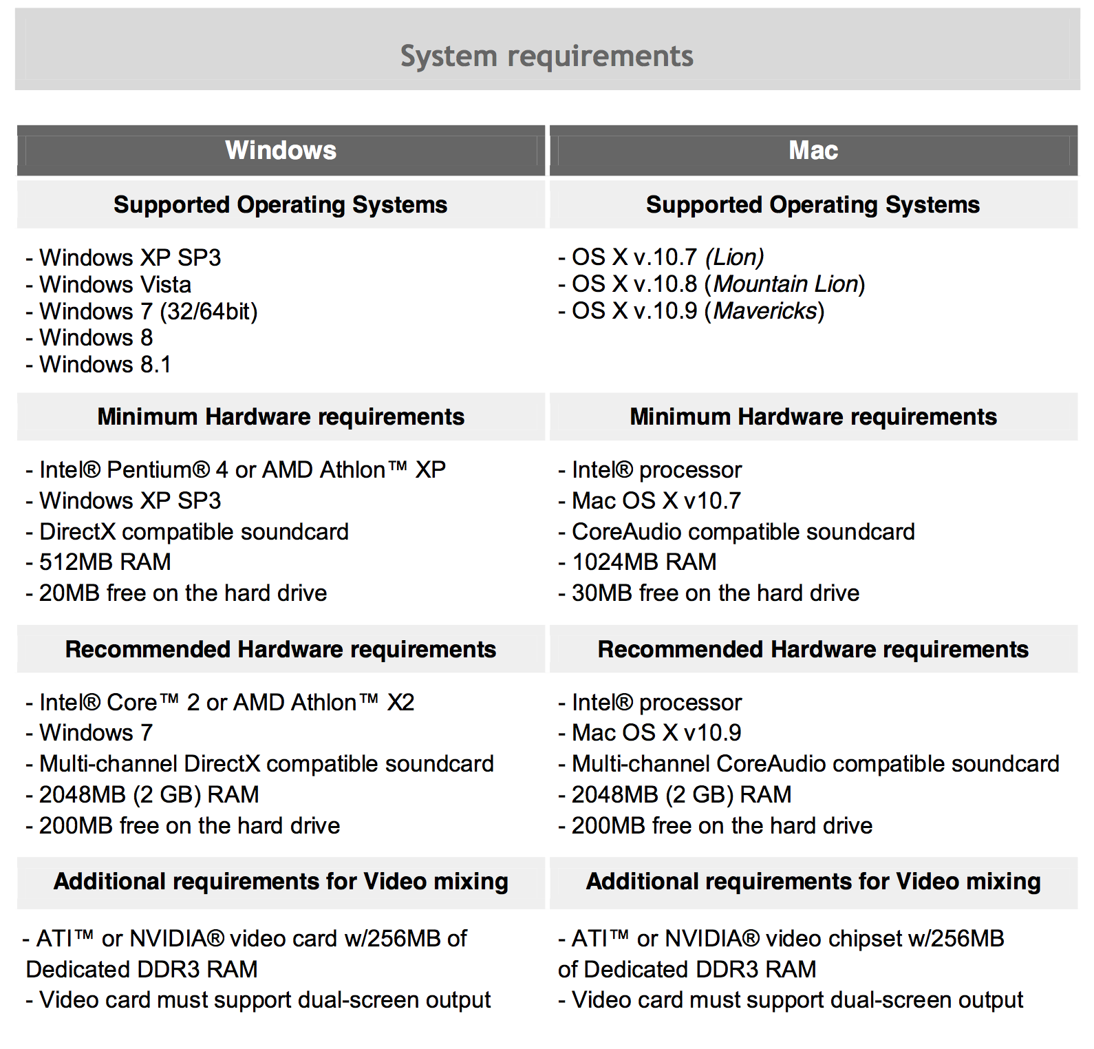 Denn entscheidend sind die Systemanforderungen, die jede DJ-Software mit sich bringt. Die Specs des Controllers sind bei der Rechnersuche Nebensache. Hier kommt höchstens zum tragen, das für den Anschluss ein entsprechender Port am Rechner vorhanden ist. In den meisten Fällen ist damit ein USB-Port gemeint. Nachstehend findest Du als Beispiel jeweils die Systemanforderungen von Virtual DJ 8, Serato DJ und Traktor Pro 2.7: