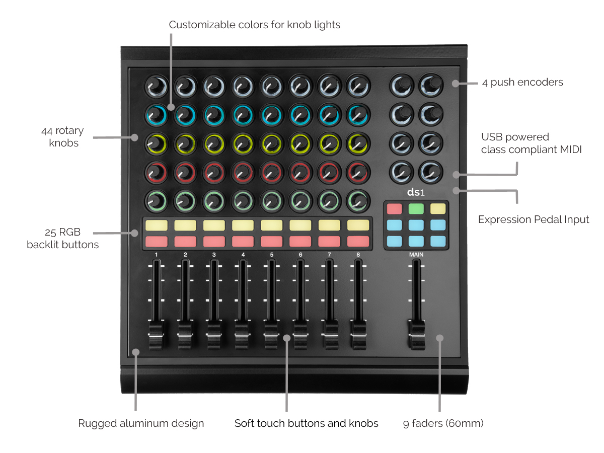 Der Livid DS1 ist eine portable Controller-Lösung für computerbasiertes Mixing. Anders als beim Livid Base 2, steht hier nicht das Mixing über eine Clip-Matrix im Fokus, wie es gerne im Live-Einsatz genutzt wird, sondern eher der Zugriff auf Mix-Parameter wie Lautstärke, EQ, Signal Routing und Soundprocessing. Dem entsprechend ist das Layout des Livid DS1 an das eines kleinen Studio-Mixers angepasst. Mit 9 Kanal-Fadern, 44 Rotary Reglern, 25 RGB Tasten und 4 Push-Encodern bietet der DS1 eine menge Steuermöglichkeiten für kleinere Mix-Projekte oder als Ergänzung im Live-Einsatz. Das ganze kommt in einem kompakten Aluminium-Gehäuse. Die MIDI-Signale werden per USB übertragen und einen Anschluss für einen Fußschalter gibt es auch. Der DS1 wurde bereits Anfang des Jahres noch mit einem kleinen Display vorgestellt, welches nun doch den Push-Encodern gewichen ist.