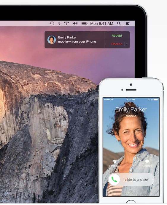 Die Continuity-Funktionen in Yosemite machen Mac und iOS-Gerät zu perfekten Gefährten. Sobald sich iPhone oder iPad in der Nähe des Mac befinden, ermöglicht Handoff den Beginn einer Aktivität auf einem Gerät und die Übertragung an ein anderes. Instant Hotspot macht die Verwendung des Hotspots des iPhone so einfach, wie eine Verbindung zu einem Wi-Fi-Netzwerk. Ab sofort werden sämtliche SMS- und MMS-Nachrichten, die zuvor ausschließlich auf dem iPhone eines Nutzers erschienen sind, auf allen Geräten angezeigt. Man kann SMS- oder MMS-Nachrichten sogar direkt vom Mac senden und iPhone-Telefonate tätigen oder empfangen, indem man den Mac wie eine Freisprecheinrichtung nutzt.