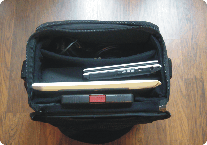 Um sich das Fassungsvermögen ein wenig besser vorstellen zu können: aktuell hab ich den Trolley mit 15" Laptop (incl Sleeve) & Netzteil, Audio 8 DJ incl Multicore, 4 TCVs, Vestax TR-1, 4 USB-Kabel, 3-fach Stecker, HD-25, 2 Concorde-Systeme im Case, Plattenbürste, Isolierband, Kaugummis, Zettel & Stift, 4 Leer-CDs im Slimcase und weiterem Kleinkram beladen. Und es wäre sogar noch Platz für 4 - 5 weitere Platten oder sonstigem Gedöns. Anmerkung Ole: Für die Fotos habe ich mal fix improvisiert: Laptop 12", Netzteil, SSL-Box, Sennheiser HD25, drei Vinyl und Kabel.