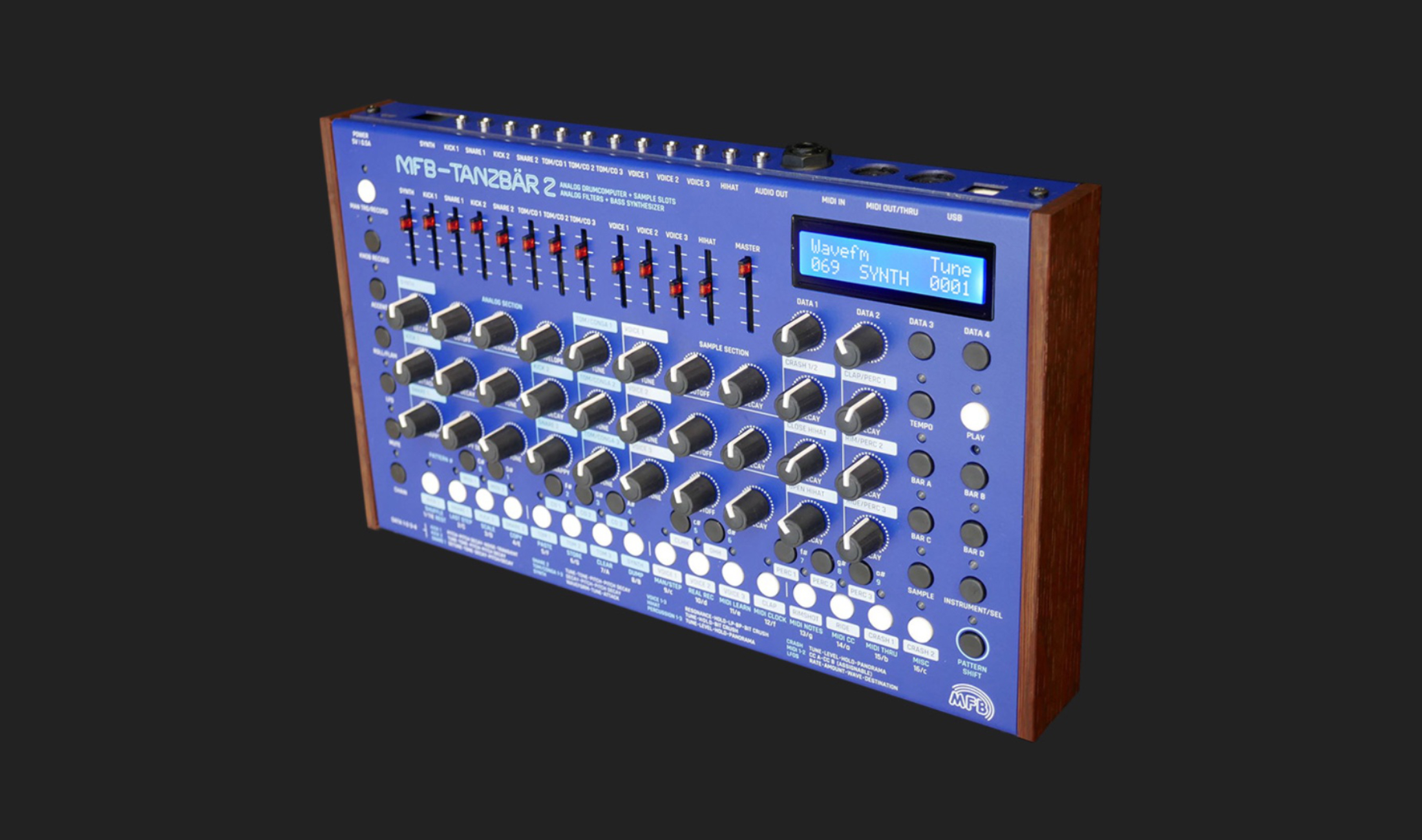 Der neue Tanzbär ist für 979 EUR ab sofort erhältlich. Dazu bekommt ihr ein Plug-in zur Sample-Bearbeitung und Verwaltung der Sounds. Mehr Infos über den hybriden Analog/Digital Drum Computer gibt’s auf der Website von MFB.