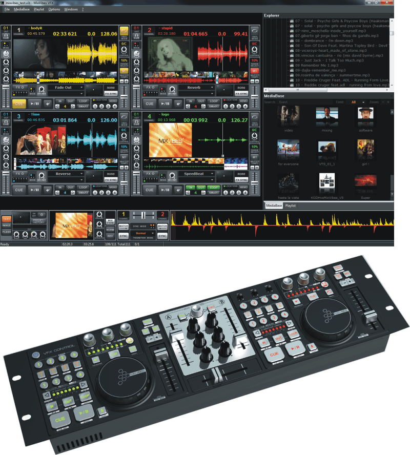 Dabei handelt es sich um eine Kombination aus einem 19" MIDI-Controller, mit eingebauter Soundkarte, und einer DJ / VJ Software. Die VFX-Software emuliert den klassischen DJ-Bereich mit zwei (bzw. bis zu vier) Decks und Mixer.