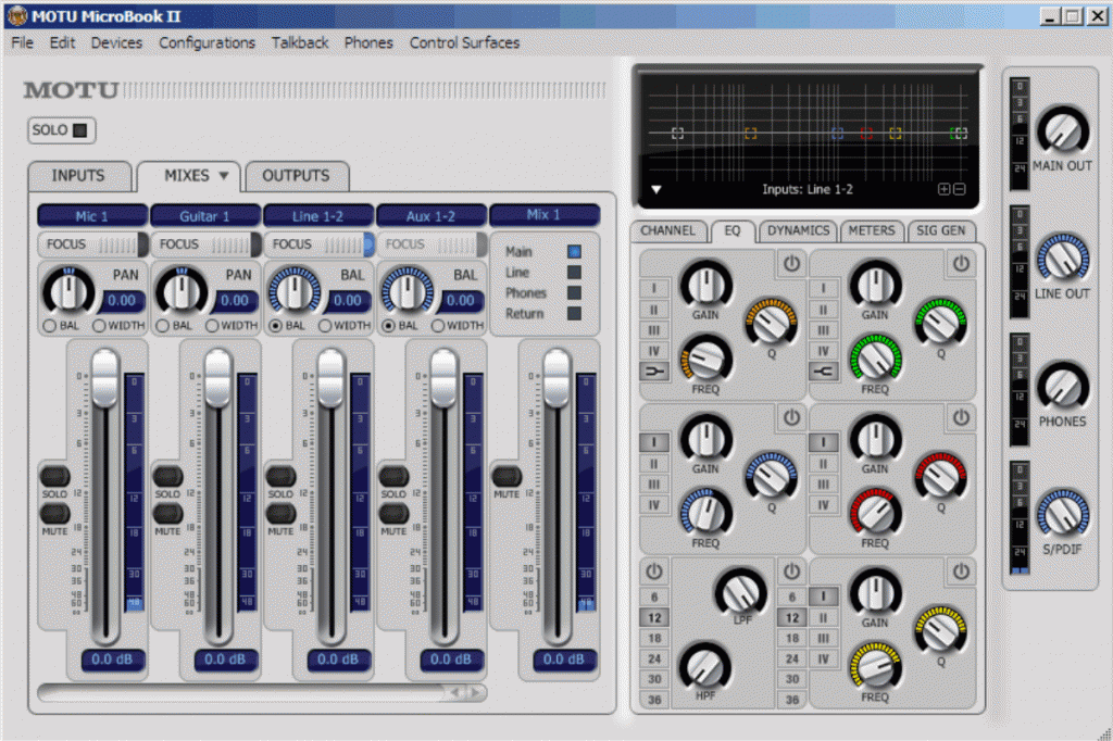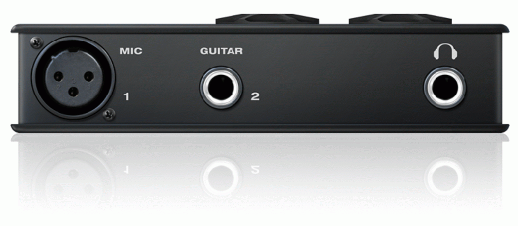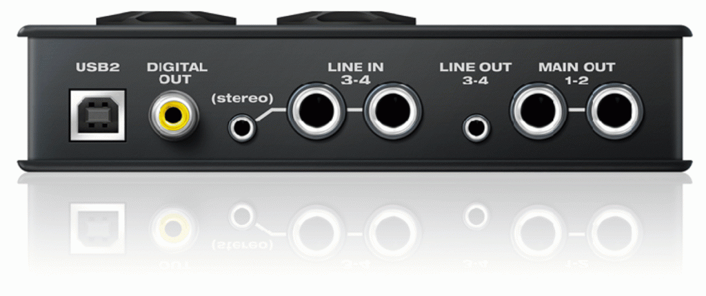 Auf der Vorderseite findet sich ein XLR-Mikrofon- und ein 6,3mm Klinken-Gitarreneingang, die dritte Buchse (ebenfalls in 6,3mm Ausführung) ist für den Kopfhörer reserviert. Rückseitig wird die Sache mit USB-B-Buchse, koaxialem Digital-Out, symmetrischem Line-In (2 x 6,3mm Klinke bzw. optional auch unsymmetrisch per 3,5mm Stereoklinke), Main-Out 1/2 (2 x 6,3mm Klinke symmetrisch) und Line-Out 3/4 per 3,5mm Stereoklinke komplettiert.