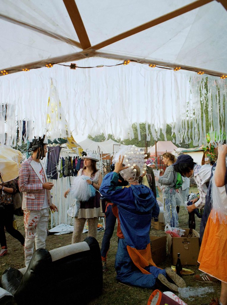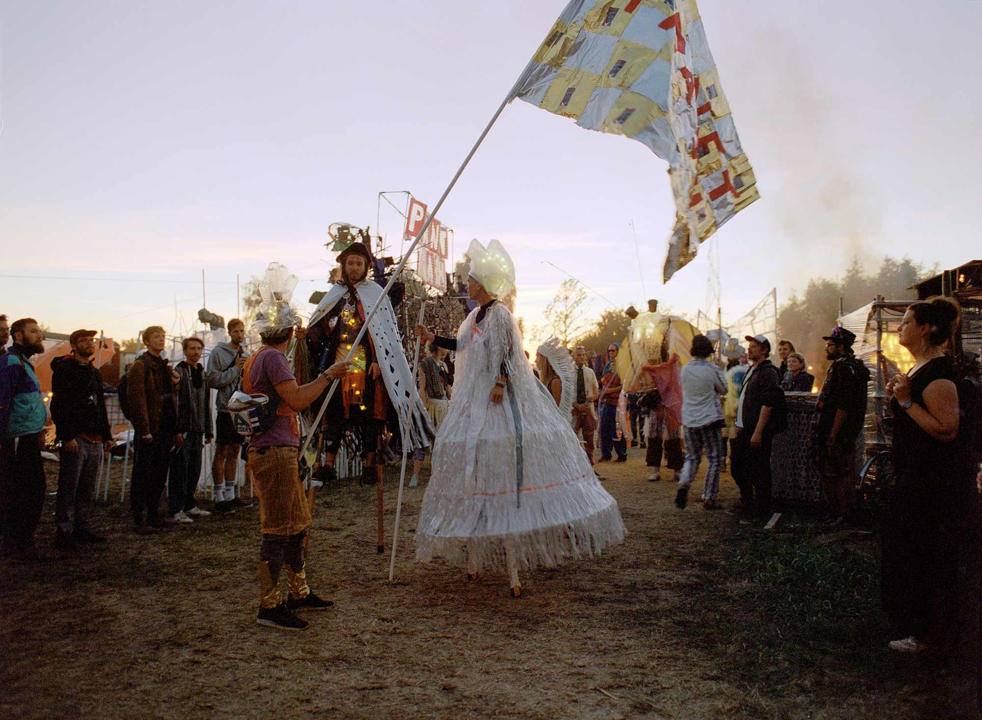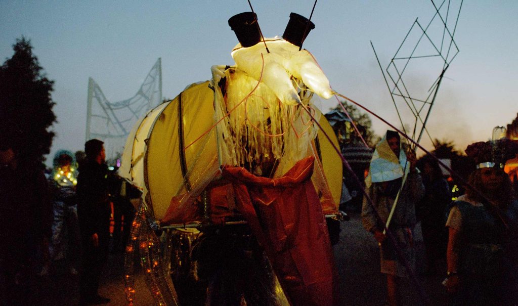 Eine Flagge aus alten Kaffeefiltern, ein überlebensgroßes, von sechs Menschen getragenes Krabben-Kostüm aus Zeltfragmenten, und Verkleidungen aus Verpackungsmüll: So zieht die Trashparade über das Festivalgelände der Fusion. Viele Feiernde bleiben erstaunt stehen oder nähern sich fragend den seltsamen Gestalten auf Stelzen. „Habt ihr nicht letztes Jahr etwas vergessen?“, rufen diese und schwenken ihre verlängerten Arme aus recycelten Müllbeuteln und Plastikfolien.