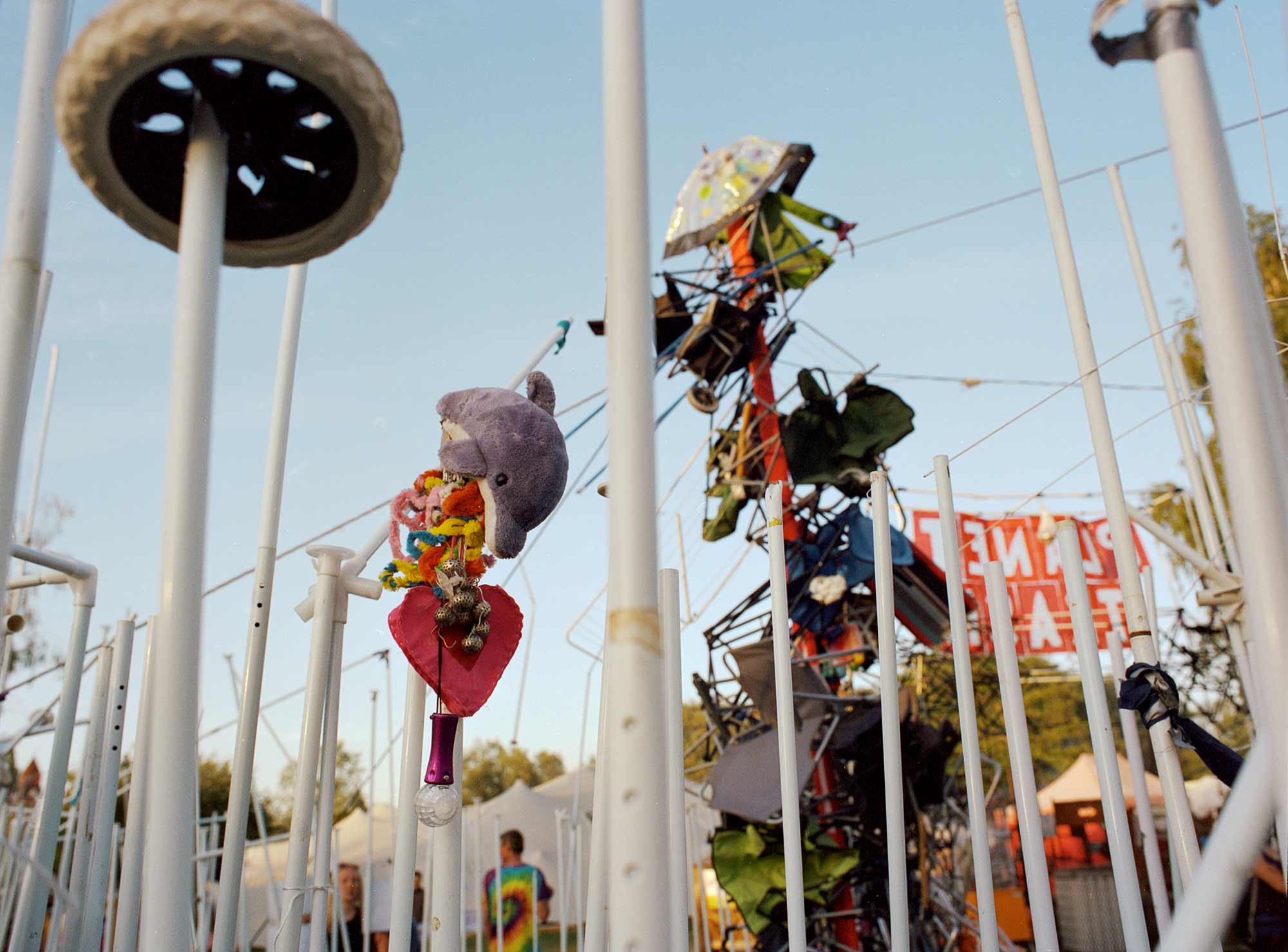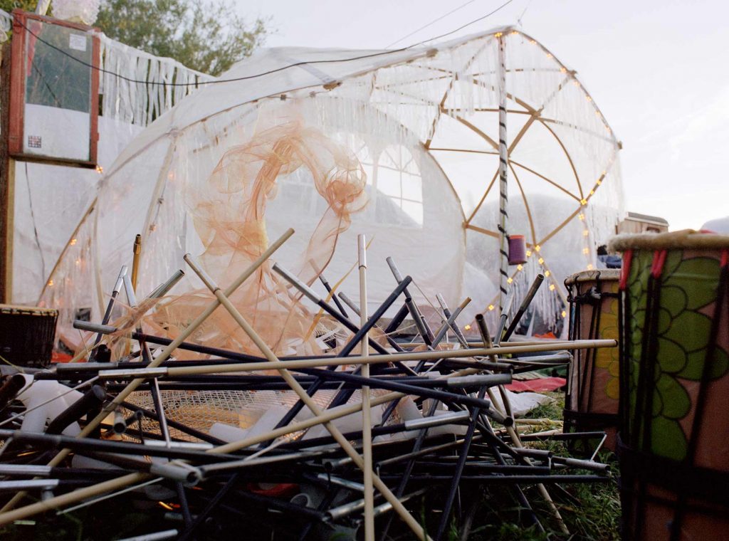 Und genau diese Massen möchten sie und die anderen Kollektiv-Mitglieder*innen durch ihre Kunstaktionen sichtbar machen. Aus dem Müll des Vorjahres bauten sie auf der Fusion 2019 neben den Kostümen für die Trashparade unter anderem einen Dome aus Lattenrostlatten, ein Labyrinth aus Pavillonstangen und einen Marterpfahl aus Campingstühlen.