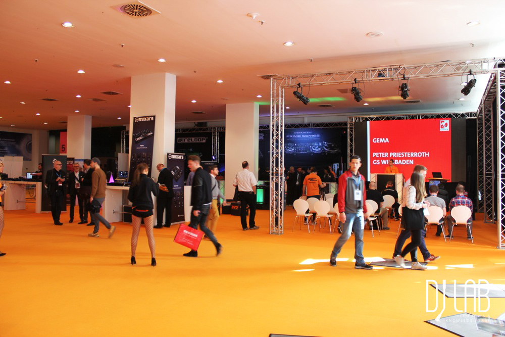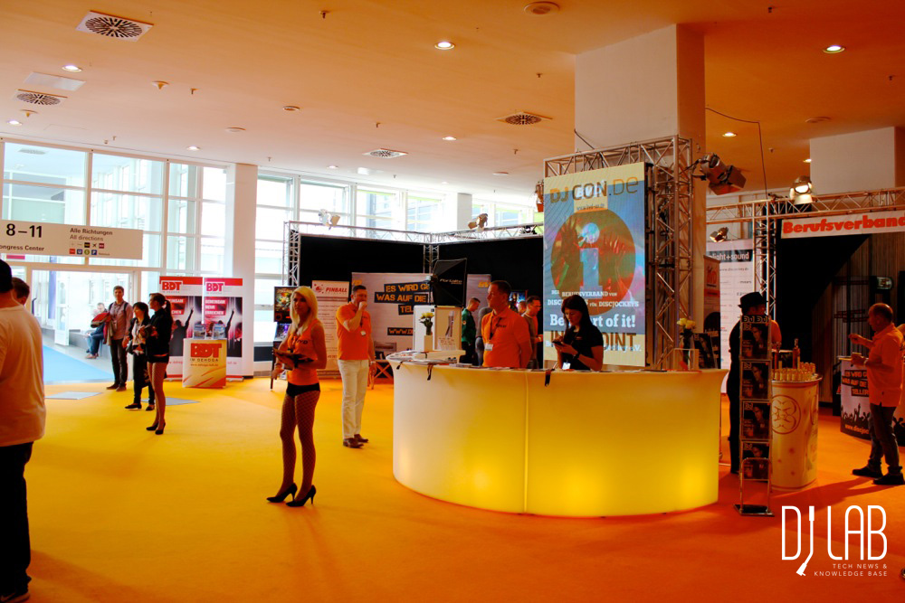 im Übergang von Halle 5.1 zur Halle 6.1 befand sich erneut die DJCon. Das waren ca. 900qm, die vom Berufsverband Discjockey e.V. (BVD) betreut wurden und auf die sich Reloop, Denon DJ, Mixars, Allen & Heath und Pioneer DJ mit ein paar Tischen reingemogelt hatten. Das in Orange getränkte Areal mit einer kleinen Ecke für Vorträge und einer DJ-Kanzel auf der gegenüberliegenden Seite, stand ganz in der CI des BVD und versprühte den Scharm vergangener DJ-Meetings, bei denen der Großraumdiskotheken-Sound primär den Vibe vorgab. Und natürlich gab es auch die zwei Mädels mit Hotpants und Highheels wieder. Dies war das Angebot der Frankfurter Messe zum Thema DJ, wobei man hier dem BVD keinerlei Vorwürfe machen darf. Denn die hatten selbst, so habe ich es mir sagen lassen, erst 6 Wochen vor Messebeginn ein "Go" von der Messe bekommen und den DJ-Herstellern, die keinen dezidierten DJ-Stand auf der Messe hatten, Showfläche zur Verfügung gestellt.