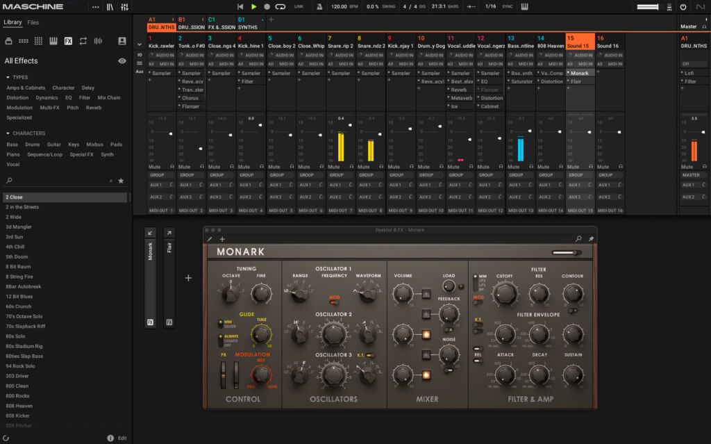 Maschine 3 bietet ein neues Design und ist neben der Erstellung von Beats auch auf die Bearbeitung von Samples ausgelegt. Ein Clip-basierter Sequenzer ermöglicht das Verschieben von Noten, das Verändern der Anschlagsdynamik, das Aufzeichnen von Modulationen und vieles mehr. Alle Signale durchlaufen den Mixer, der über Sound- und Gruppenkanäle verfügt. Für die Beat-Produktion stehen sechs monophone Drum-Plugins mit 29 Sound-Engines zur Verfügung, darunter neun Kicks, neun Snares, drei Hi-Hats, drei Toms, drei Percussions und zwei Cymbals. Dazu kommen 24 Mix- und acht Performance-Effekte.