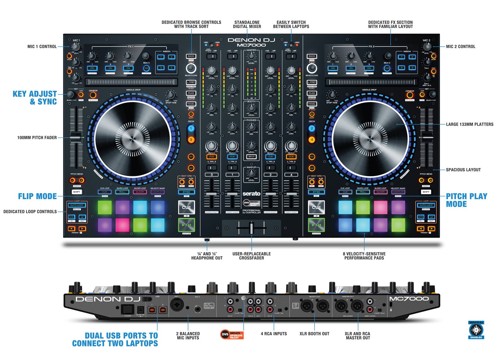 Ebenfalls frisch auf der DJ Expo in Atlantic City präsentiert Denon DJ den MC7000, einen 4-Kanal DJ-Controller mit zwei USB-Anschlüssen für Serato DJ. Der MC7000 besitzt dem entsprechend 2 Audio-Interfaces, um so einen fließenden Wechsel zwischen zwei DJs zu gewährleisten.