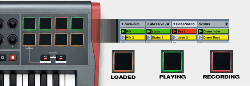 Daneben gibt es bei allen drei Modellen jeweils 8 anschlagdynamische Drum-Pads, die in drei Farben leuchten können. Damit soll es zum einen möglich sein, sich Arpeggio-Schritte optisch anzeigen zu lassen und zum anderen - wenn man die Pads zur Clipsteuerung in Ableton Live nutzt - auch den aktuellen Clip-Status, also "grün = play", "gelb = belegt" und "rot = Aufnahme". Über eine integrierte Roll-Funktion können die Pads automatisch getriggert werden.