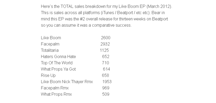 Wovon lebt so ein Artist eigentlich, wenn er alles verschenkt? Von DJ-Auftritten? Von einem Dayjob? Oder von Luft & Liebe? Mit einer detailierten Einkommensauflistung hatte NICK THAYER bereits im Frühjahr eine Debatte angestoßen und Einblick in die Verdienstmöglichkeit eines, zwar mittelbekannten, aber immerhin global gebuchten, Produzenten / DJs gegeben. Das Fazit: ernüchternd. Die Folge: ein Spendenbutton. Nick stellt also frei ob und wieviel man zahlen möchte. Ein Model, welches es auch bei Bandcamp gibt und was unter dem Namen Laterpay gerade als große Hoffnung zur Finanzierung von Inhalten im Netz gehandelt wird. Bleibt also abzuwarten was für Zahlen in der nächsten Einkommensauflistung des Mr. Thayer stehen werden.
