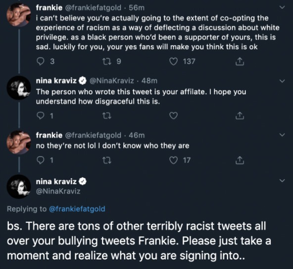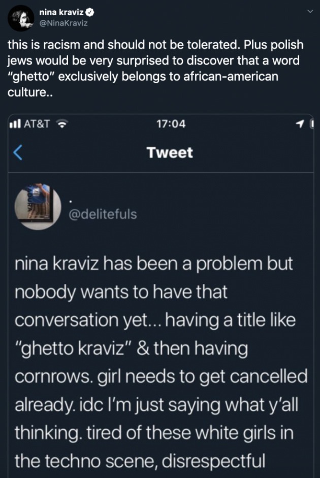 Kraviz hat die meisten Tweets rund um die Diskussion mittlerweile gelöscht und ein Statement veröffentlicht, indem sie betont, dass die Angelegenheit aus dem Ruder gelaufen und sie kein Rassist sei.