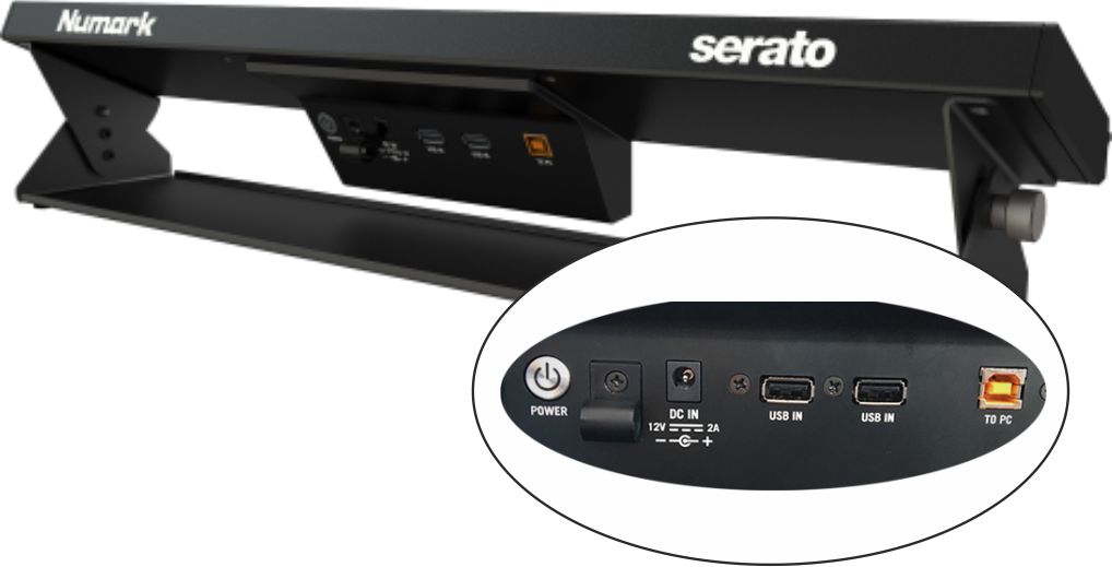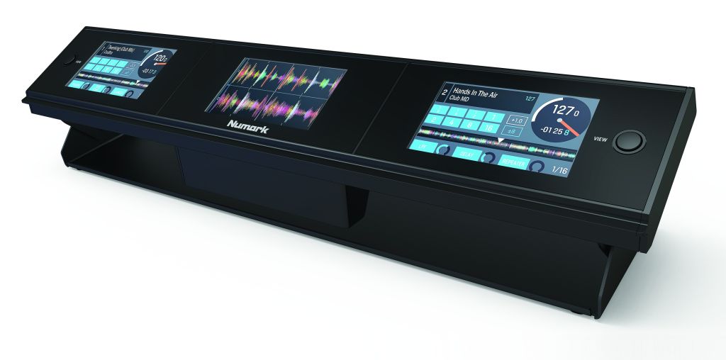 Das NUMARK DASHBOARD ist ein höhen- und neigungsverstellbares Gestell mit drei 4,3" LCD-Displays. Angeschlossen wird das über USB an den Rechner. Auf dem läuft noch immer SERATO DJ, allerdings kann er beiseite gestellt oder zugeklappt unter einen Tisch verbracht werden. Weitere USB-Geräte lassen sich über einen integrierten Hub verbinden.