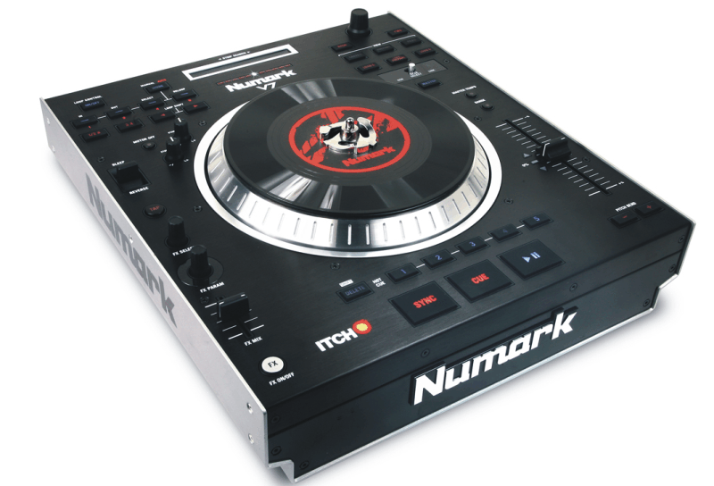 Bei diesem Gerät fließt die schon vom NS7 bekannte Technologie ein. Echtes Vinylfeeling an einem Controller, dank motorisiertem 7" Plate mit Slipmat, echtem Vinyl, einstellbarem Drehmoment, wie an einem "richtigen Plattenspieler" und hochauflösendem MIDI. Eine Library Navigation ohne Maus und die Strip Search Funktion zum "virtuellen Nadelversetzen" macht aus dem V7 mehr als einen schnöden MIDI-Controller. Per Link-Funktion lassen sich mehrer V7 vernetzten. Integriert ist ein 24bit Audio-Interface. Mit ausgeliefert wird, wie schon beim NS7, die Software ITCH von Serato.