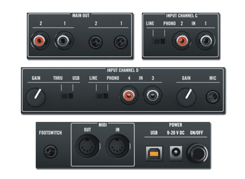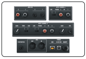 Neben symmetrischem Masterausgang (per 6,3mm Klinke; alternativ auch unsymm. per Cinch) gibt es auch zwei externe Line/Phono Eingänge, von denen man einen per Schalter direkt durchschleifen kann (z.B. zum Notbetrieb). Um diese Quellen jedoch mixen zu können, muß man sie durch die Software routen - das Gerät hat keine Standalone-Mixerfunktion. Wer gerne lautstark mit der Außenwelt kommuniziert, kann letztlich auch ein Mikrofon anklemmen.